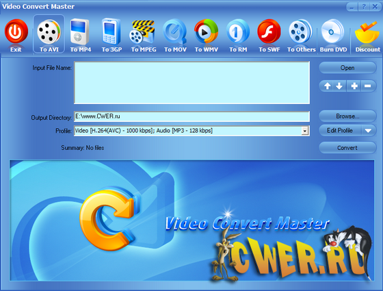 Video Convert Master - универсальный конвертор видеофайлов. Прост в работе - при этом сочетает в себе быстроту и качество обработки. Конвертирует AVI, DVD, VCD, SVCD, MPEG, MPEG 1, MPEG 2, MPEG 4, RM, RMVB, WMV и др. форматы. Записывает видео в DVD/VCD/SVCD. Записывает изображение с DV, WEB Camera, VCR, TV Tuner, и Analog Camera.