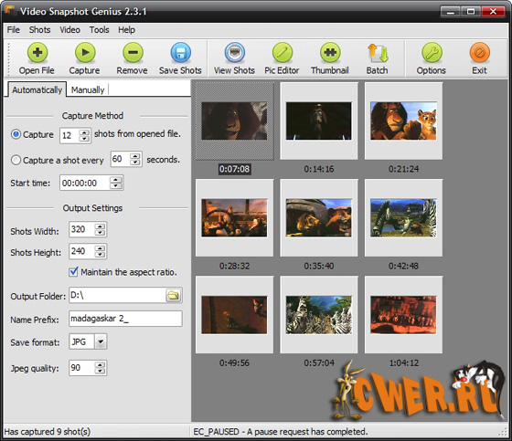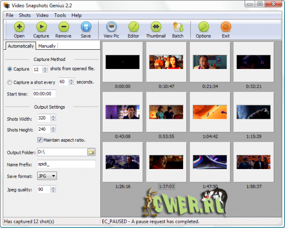 Video Snapshots Genius - позволяет Вам быстро и легко захватывать любимые места в фильмах форматов MPEG, AVI, WMV, DivX, RealMedia, QuickTime и DVD, впоследствии сохранять их в форматах BMP, JPEG, GIF, PNG и TIFF. Video Snapshots Genius поддерживает множество методов захвата. Вы можете установить определенное число кадров на определённых интервалах времени и т.д. Программа прекрасно подойдет для создания анонсов новых фильмов.